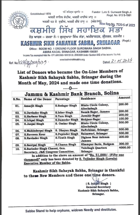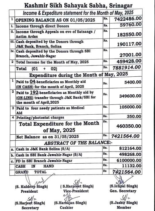 The Kashmir Sikh Sahayak Sabha (Regd) is providing help to 170-beneficiaries such as widows, orphans and poor students as monthly aid of Rs. 2,000/-, Rs.1,000/- Rs.800/- & Rs. 700/- as on date through “On-Line” transfer to their individual accounts;