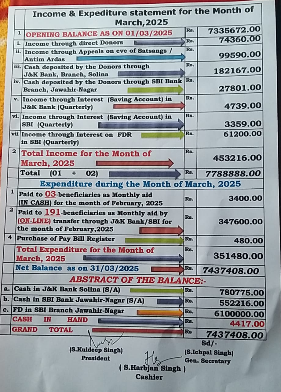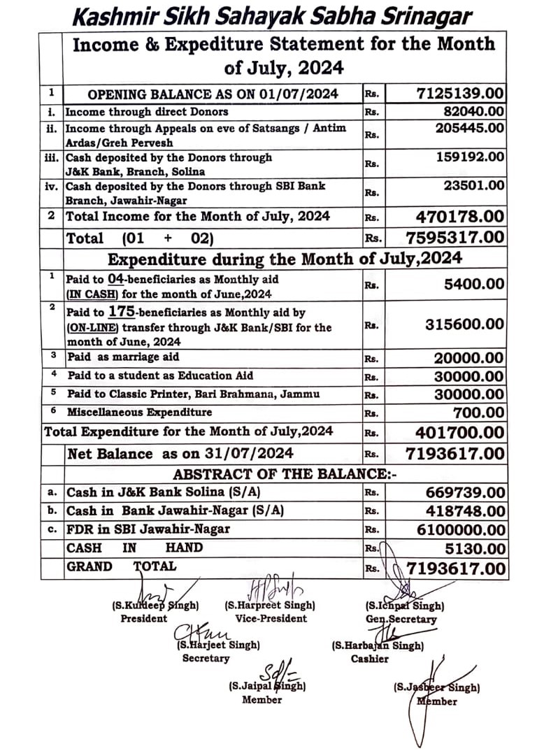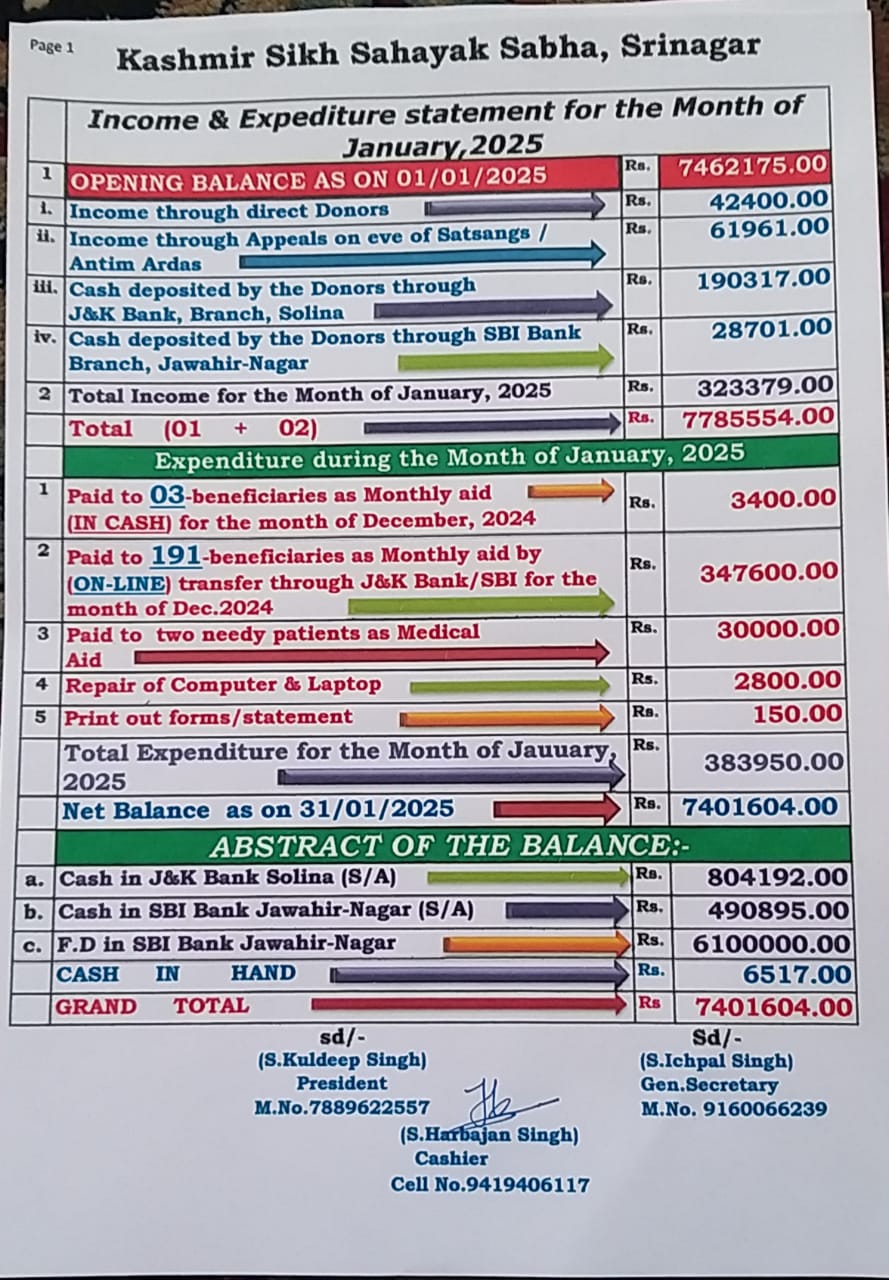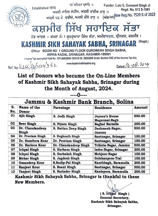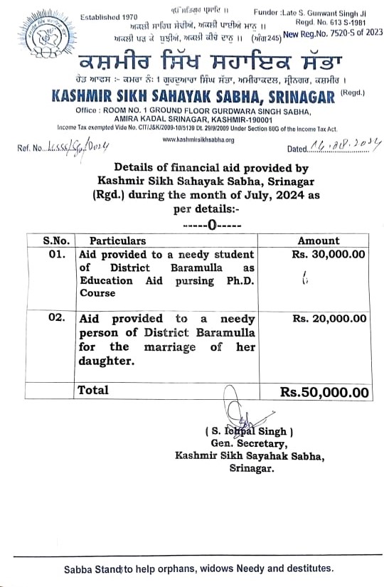 The Kashmir Sikh Sahayak Sabha (Regd) is providing help to 170-beneficiaries such as widows, orphans and poor students as monthly aid of Rs. 2,000/-, Rs.1,000/- Rs.800/- & Rs. 700/- as on date through “On-Line” transfer to their individual accounts;